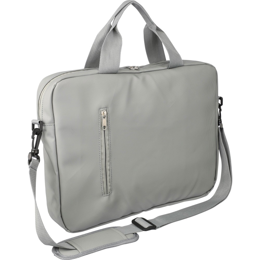 Laptoptáska 15"-es laptophoz PU anyagból, két cipzáras első zsebbel, egy nagy cipzáras rekesszel és tépőzáras laptop résszel, valamint több belső zsebbel. Állítható vállpántokkal és két fogantyúval rendelkezik. Vízlepergető. Anyaga: PU.