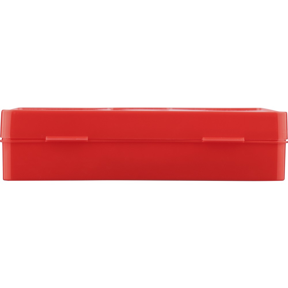 PP anyagból készült elsősegélykészlet piros tokban, a felső részen fehér kereszttel és csatos záródással. Tartalma: 2 nemszőtt törlőkendő, 5 ragtapasz, 4 alkoholos törlőkendő, 1 olló, 1 tekercs 450 cm hosszú gézkötés és 1 tekercs 450 cm hosszú ragasztószalag.