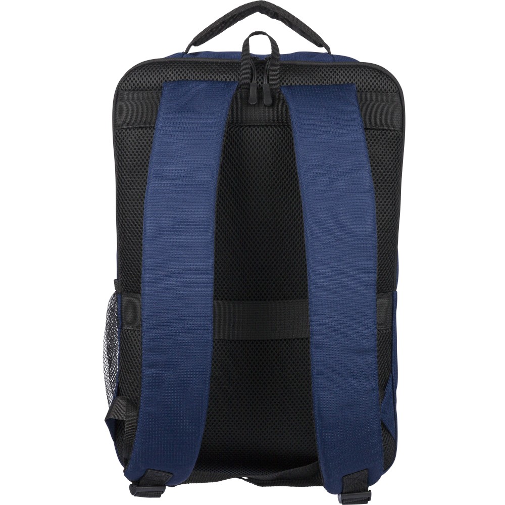 RPET 300D Ocean Bound anyagból készült hátizsák, amely újrahasznosított óceáni műanyagból készül, tartós és texturált felületű kialakítással. 20 literes űrtartalommal rendelkezik, két nagy cipzáras rekesszel, párnázott 15 hüvelykes laptoprekesszel, két elülső zsebbel, hálós oldalzsebbel és felső fogantyúval. Szellőző vállpántokkal, párnázott hátoldallal és bőröndre rögzíthető pánttal ellátva, a terméken Ocean Bound Plastic alapanyagra utaló címke található.