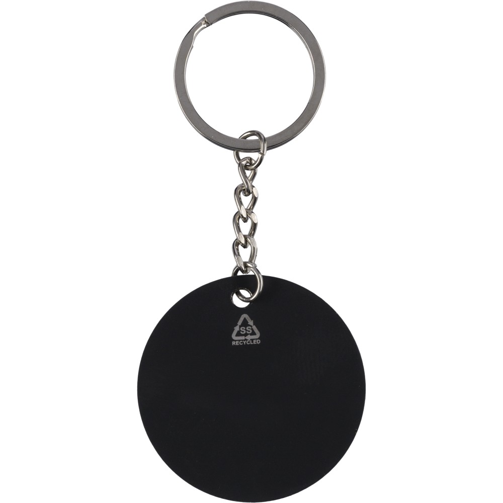 Újrahasznosított rozsdamentes acélból készült, gumírozott felületű focis kulcstartó fém karikával. A kulcstartón gravírozott recycled (újrahasznosított) alapanyagra utaló logó található, amely gravírozás után fényes, tükörszerű hatást mutat. Egyenként kraft papírtasakba csomagolva.