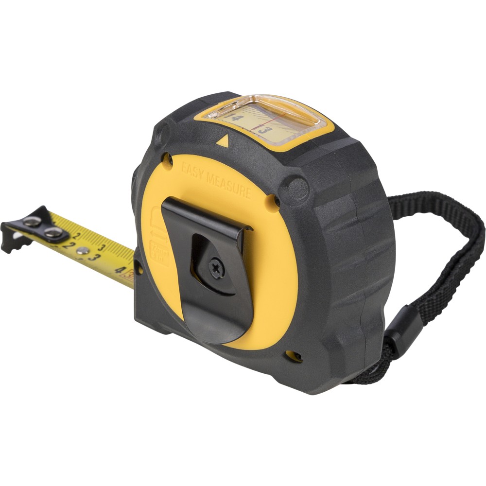 ABS és TPR anyagból készült mérőszalag, 3 m hosszúságú és 16 mm szélességű, kétoldalas fém szalaggal. Átlátszó felső ablak a pontos belső mérésekhez. Rendelkezik rögzítés/kioldás funkcióval, hátoldali csipesszel és poliészter csuklópánttal. Darabonként illusztrációval ellátott barna kartondobozba csomagolva.