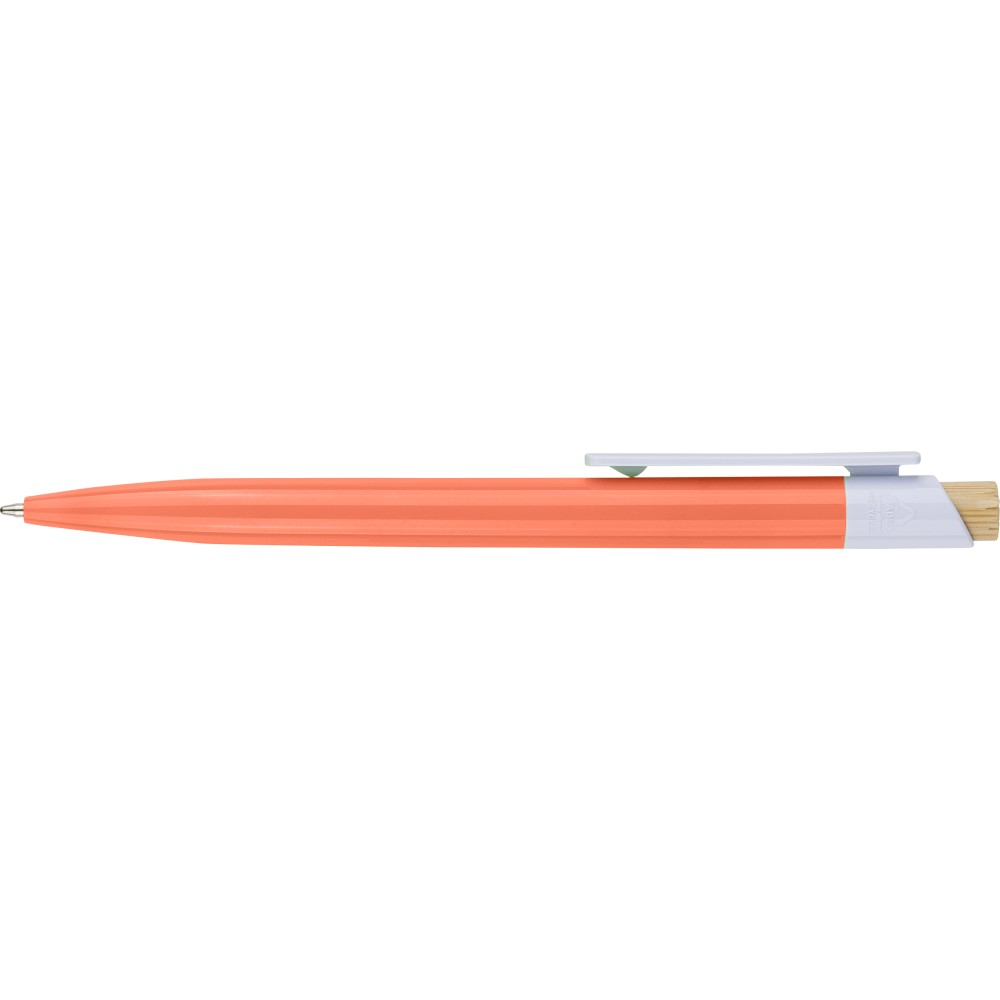 Újrahasznosított ABS-ből készült golyóstoll bambusz nyomógombbal és fehér klippel, digitális nyomtatásra alkalmas kivitelben. A tolltesten fröccsöntés során elhelyezett recycled (újrahasznosított) alapanyagra utaló logó található. Megközelítőleg 600 méter íráshosszúságú, kék színű tollbetéttel.