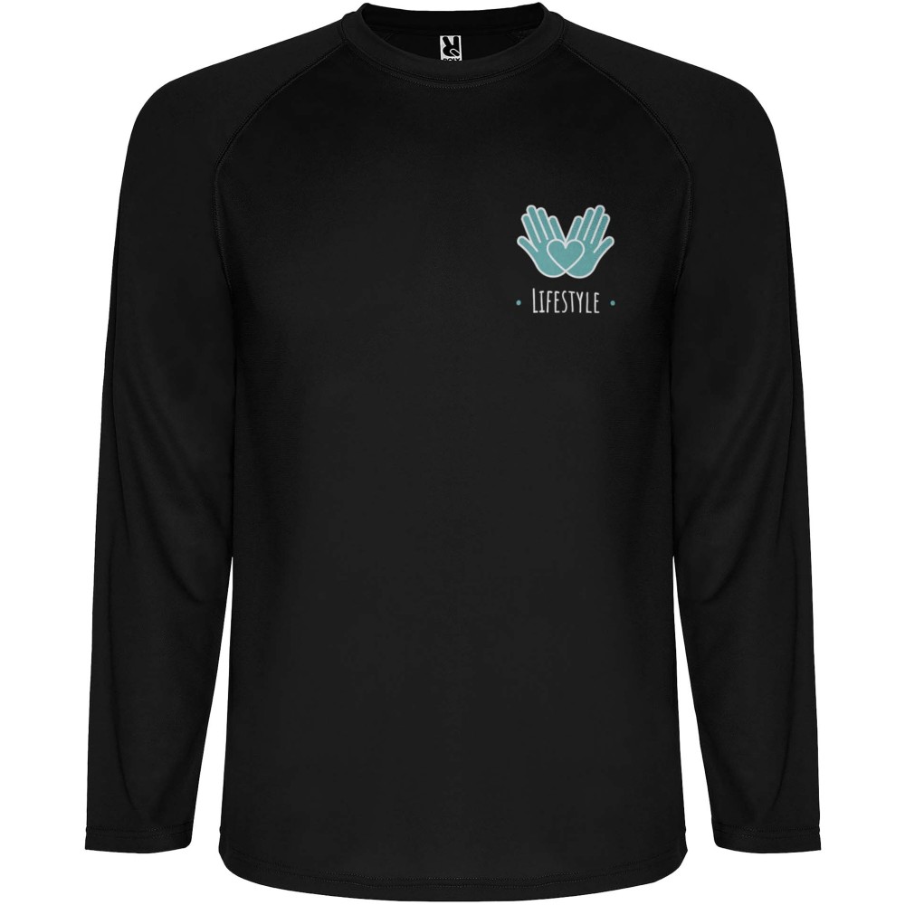 Hosszúujjú technikai raglánujjú póló. Illeszkedő overlock varrások az ujjakon (oldalsó varratok nélkül). Fedett varrások a nyaknál. Lélegző, könnyen mosható és gyorsan száradó anyag. Levehető címke.