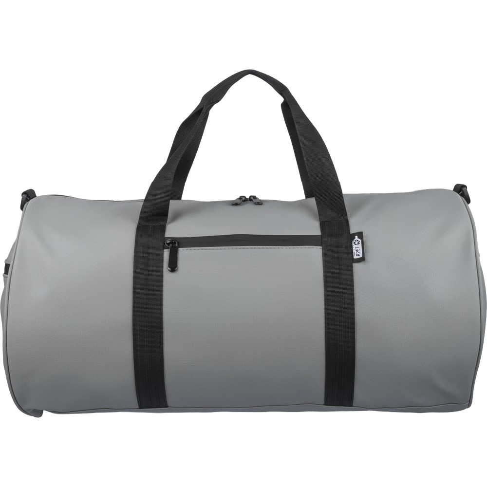 600D poliészterből készült rPET sporttáska 210D béléssel és vízlepergető PU bevonattal, 40 literes űrtartalommal. Elülső és oldalsó cipzáras zsebbel, hálós oldalzsebbel, két fogantyúval és állítható vállpánttal rendelkezik. Külső felületén rPET címkével ellátva.